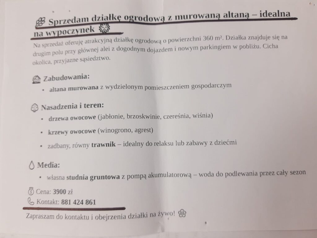 Zarząd Rodzinnego Ogrodu Działkowego „XX-lecie” w Środzie Śląskiej informuje, że posiada WOLNE DZIAŁKI ogrodnicze w swoich granicach.